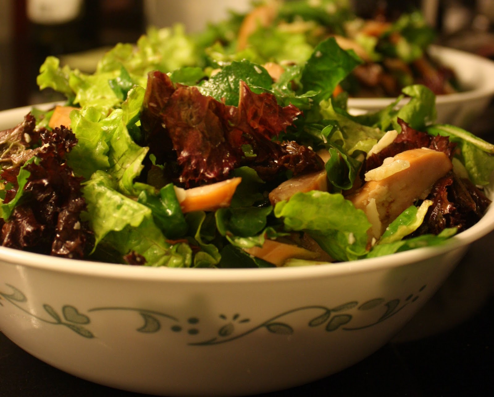 Then we got down to the salad. There is a history to this salad. It’s quite a lovely mix of flavours – and the Dehlvi’s have eaten this for years. It’s probably the salad that got F onto eating some salad, and it’s the ONLY salad that Farooq eats. The last few times though, the quality of the salad has varied (little parmesan, even less sundried tomatoes). Making this salad at home is SUPER easy, and also you’re never stingy! Its got: smoked chicken breasts, some mixed lettuce, rocket, sundried tomatoes, parmesan and an olive oil and balsamic vinegar dressing.
